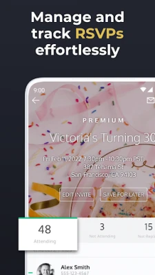 ● Track RSVPs and manage guest lists with reminders and plus-one options
